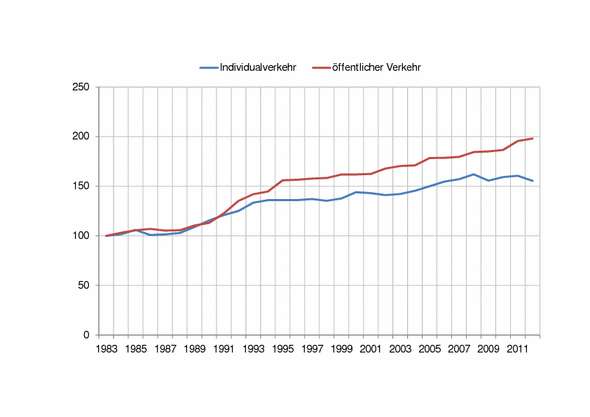 Angesichts dieser Entwicklung wäre eine Förderung des öffentlichen Verkehrs dringend nötig. Doch die Verkehrspolitik ging in die falsche Richtung. Der ÖV wurde teurer und teurer. Die Preise für den öffentlichen Verkehr stiegen nicht nur stärker als die Kosten für das Autofahren. Sondern die Preisanstiege im ÖV waren sogar stärker als die Lohnerhöhungen, wie die Grafik unten zeigt.