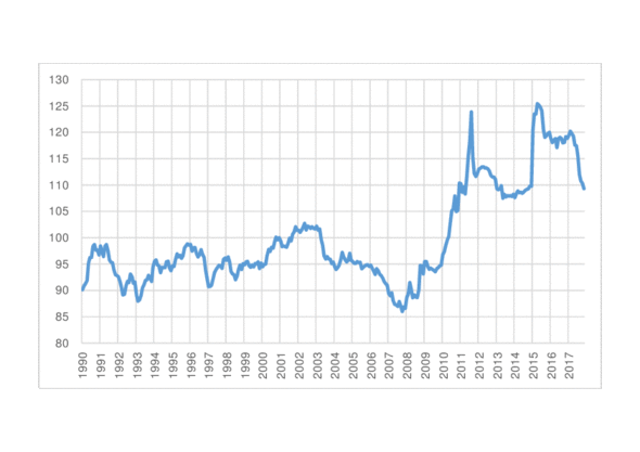 Effektiv dürfte der Franken nach wie vor deutlich überbewertet sein. Schätzungen des SGB mit verschiedenen Methoden zeigen, dass die Kaufkraftparität wohl eher im Bereich von 1.25 bis 1.35 liegen dürfte. Das zeigt auch ein Vergleich mit Deutschland, dessen Wirtschaftsstruktur der schweizerischen ähnelt. Bis zur starken Aufwertung im Jahr 2009 schwankte der „reale“ Wechselkurs gegenüber Deutschland um einen relativ konstanten Wert – d.h. um einen Indexwert von rund 95. Heute liegt dieser Index bei ungefähr 110. Der Franken wäre so um rund 15 Prozent überbewertet, was einem Franken-Euro-Kurs von über 1.30 entspricht.
