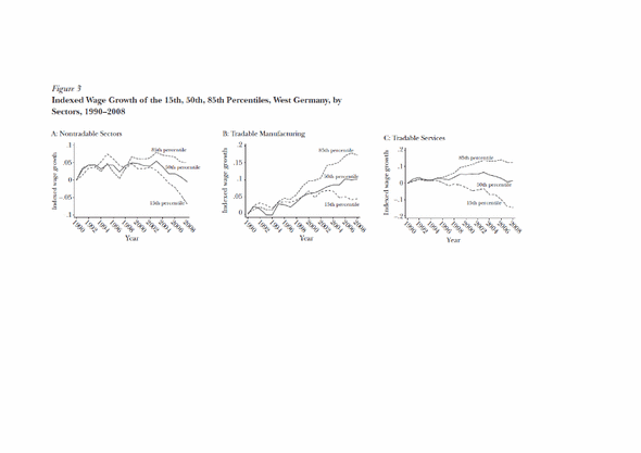Angesichts dieser unterschiedlichen Faktoren, welche die gestiegene Wettbewerbsfähigkeit des Deutschen Exportsektors erklären, verwundert es, dass die Autoren ausschliesslich auf die gesunkenen Reallöhne abstellen, welche sie mit der Zunahme der dezentralen Lohnfestsetzung seit 1990 erklären.
