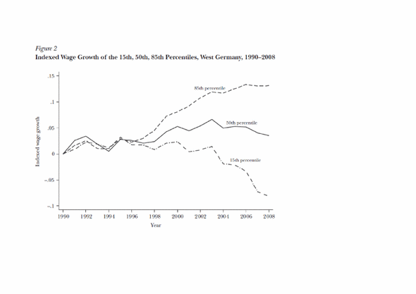 Die Reallöhne der unteren 15 Prozent sind seit 1990 massiv gesunken (um beinahe 10 Prozent). Selbst der mittlere Lohn ist seit 2003 gesunken. Hier eine Grafik aus der oben genannten Studie.